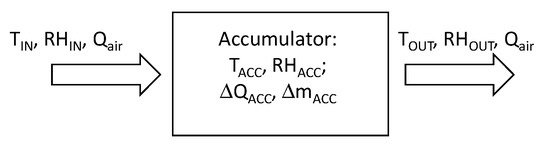 The intensity of heat and mass exchange processes in the accumulator depends on variations in temperature (TIN) and humidity (RHIN) and the flux of injected air (Qair), as well as temperature (TACC) and humidity inside the accumulator (RHACC). The diagram (Figure 7) presents input and output parameters that allow full analysis of the processes taking place in the accumulator bed.