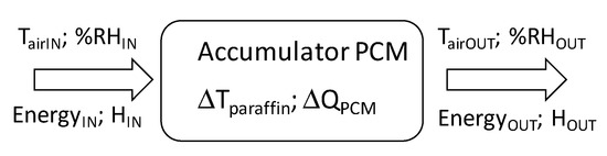 During the charging process, heat to the PCM accumulator (Figure 8) was supplied by means of an air stream heated by resistance heaters (Energy IN). As a result, the paraffin temperature (ΔTparaffin) and internal energy of the bed (ΔQACC) increased. Reception of heat from the accumulator (discharge cycle) was carried out using cool air stream (TairIN) heating (TairOUT) in the accumulator bed. The difference in paraffin temperature was calculated for each cycle of accumulator charging and discharging, thus determining how the temperature increased or decreased in a given cycle.