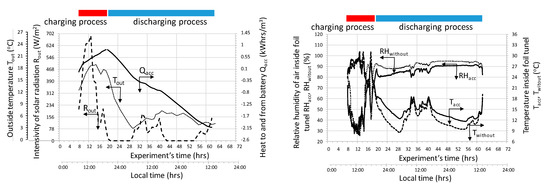 During the charging cycle, the total amount of solar radiation energy was 4.17 kWh. Whilst charging (the cycle time was nearly 11 hours), the total amount of heat stored in the accumulator (calculated per 1m3 of the bed) was 0.84 kWh/m3. In the discharge cycle (cycle duration was approximately 43 h), about 2.9 kWh / m3 was fed into the tunnel with plants. The greater amount of heat delivered to the tunnel with plants, compared to the amount of heat stored during accumulator charging, was at the expense of lowering the final bed temperature.