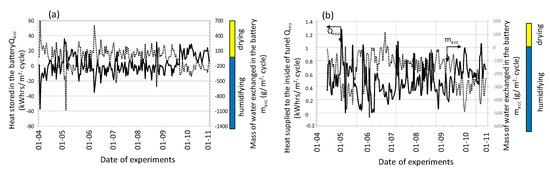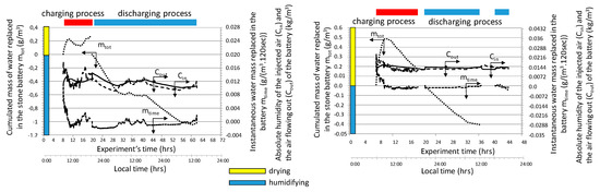 As shown in the graph (Figure 11), the air passing through the bed of the accumulator’s bed is dehumidified while the accumulator is being charged and humidified when it is discharged. The total amount of water removed from the interior of the tunnel (mtot) when charging the accumulator depends on the temperature of the injected air. As it results from the course of the presented relationships at the beginning of the charging process, the amount of water mass stored in the accumulator bed increased intensively, while with the heating of the bed the air drying rate decreases and even to the extent that humidification of exhaust air occurs. This trend was observed for both analyzed cases.