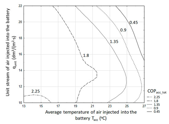 Changes in the COP coefficient taking into account energy supplied to the battery and useful energy (Figure 35) increases with increasing battery efficiency and with increasing temperature difference of the battery bed. The equation for the efficiency of the PCM accumulator was determined in the function of energy supplied to the accumulator (ES) and usable energy (QE), using a linear estimation with the quasi-Newton method. The significance of the parameters was set at a level less than 0.05.