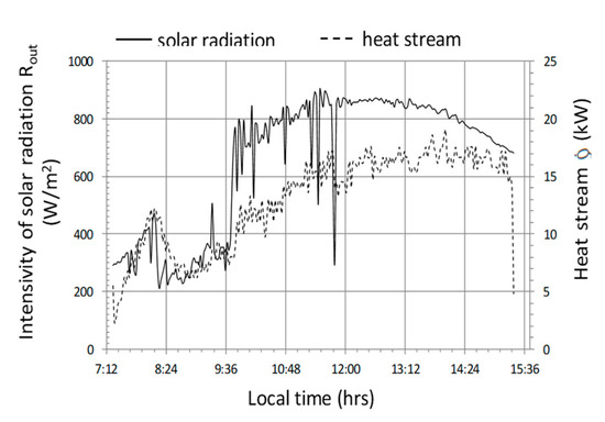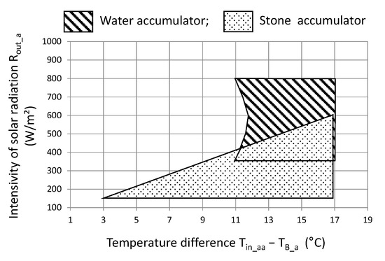The graphical analysis (Figure 36) also shows a practical premise that in the case of a stone-bed accumulator, this accumulator shows better efficiency at lower parameters, that is, temperature difference and solar radiation intensity. In turn, for a water accumulator, a higher temperature difference and a higher value of solar radiation intensity are recommended.