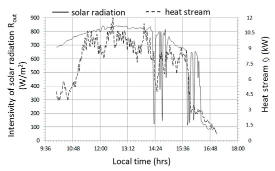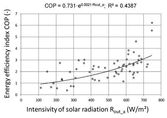 For a stone-bed accumulator, the desired energy effect can be obtained for a temperature difference (air inlet to the accumulator and bed temperature) in the range of 3 to 11 °C and average solar radiation intensity in the range from 150 to 600 W/m2. However, a water accumulator satisfies this condition if the average temperature difference is above 11 °C and the intensity of solar radiation is greater than 350 W/m². At the same time, the impact of solar radiation intensity is much smaller due to the thermal inertia of the entire accumulation system, especially during short periods of operation. However, the value of solar radiation intensity above 350 W/m² already indicates a significant share of direct radiation in the stream of solar energy reaching the tested object. Energy efficiency at COP = 3 is the lower boundary state required for the local energy system. For the purposes of a comparative assessment of the accumulators in question, the work area was also checked with an energy efficiency of not less than 5. In this respect, both stone-bed and water accumulators can be used. In the case of stone bed, such efficiency was obtained in several measurements, hence there are no grounds for safe inference for engineering practice. However, such a high efficiency can be achieved by a water accumulator, provided that the temperature difference is greater than 15 °C and the average intensity of solar radiation is above 450 W/m², which results in a full share of direct radiation.