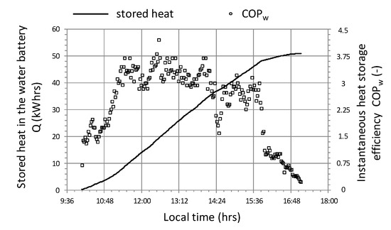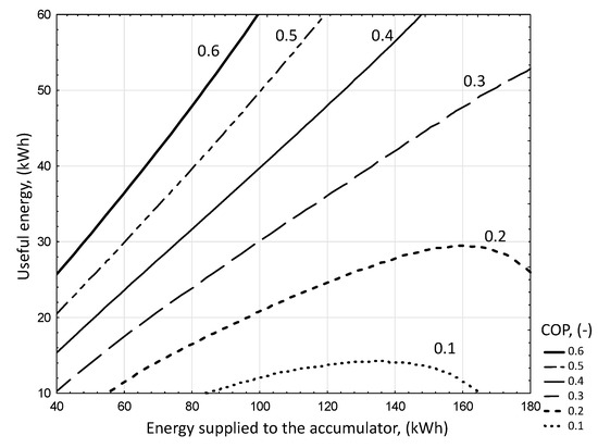 The energy efficiency coefficient of performance (COP) defined in the formulas (Equations (6), (11) and (15)) was used as the comparison criterion. This criterion takes into account the amount of heat accumulated in relation to the unit of electricity supplied to the system. With the efficiency of the electricity generation system, which in Poland is 35%, the desired energy effect should be achieved if the COP exceeds 3.0. The COP value results directly from the ratio of the primary fuel used to power plant turbines in relation to the direct use of this fuel for heating purposes. For example, if a power plant consumes 1 kWh of energy contained in the primary fuel within an hour and 0.35 kWh of energy is obtained when converting this energy into electricity, which means that that amount of electricity should contribute to the accumulation of 1kWh of primary energy. In the presented reasoning, the efficiency of the electricity transmission system and the primary fuel energy conversion system at the place of its use for the purposes of the heat accumulator was omitted. The above reasoning applies only to stone-bed and water accumulators, as in the case of the PCM battery, the power was realized by PV panels.