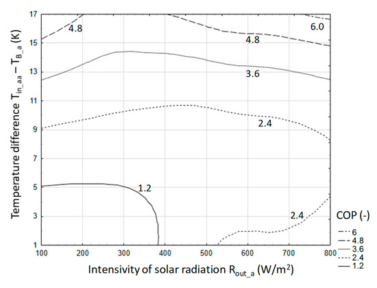 After parameterization of the relationship (19), it was established that the minimum difference Tin_aa − TB_a should be greater than 11 °C, in order to achieve the assumed efficiency (COP = 3) with solar radiation 1000 W/m². It should be noted that the relationship (20) can be used to determine the boundary parameters of the heat accumulation system in a water accumulator for specific production and construction of a greenhouse or foil tunnel.