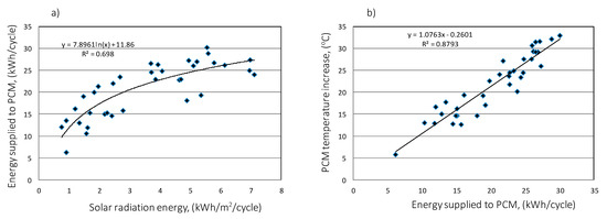 The analysis shows a clear correlation between the charging time and the amount of heat stored in the accumulator bed (Figure 29a). However, by analyzing the individual accumulator charging cycles in detail, some of them indicate that the energy accumulated in paraffin can be twice as high despite the same cycle time, which is the result of different levels of solar radiation intensity and the ability to collect heat through the accumulator bed.