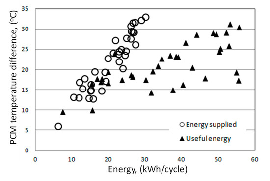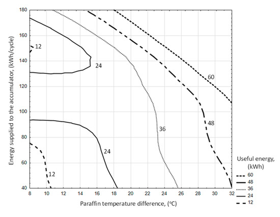 Generally, a greater amount of usable energy available in a paraffin-filled accumulator occurs in the range of higher operating efficiency (Figure 31). However, there is no clear relationship between these parameters. This means that for a certain amount of available heat, the accumulator can work with varying degrees of efficiency.