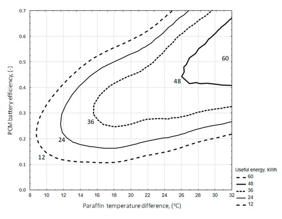 The amount of usable energy available from a battery filled with paraffin (Figure 34) increases with increasing battery efficiency and with increasing temperature difference of the battery bed. The equation used to ascertain the available useful energy in the PCM accumulator cycle was determined as a function of accumulator efficiency (Eff) and paraffin temperature increase (Δtparaffin), using a linear estimation with the quasi-Newton method. The significance of the parameters was set at a level less than 0.05.