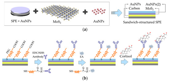 The construction and detection procedure of cortisol immunosensor. (a) Fabrication of layer-by-layer self-assembled gold nanoparticles/molybdenum disulfide/gold nanoparticles (AuNPs/MoS2/AuNPs) sandwich-structured screen-printed electrode (SPE), (b) covalent immobilization of cortisol antibody through self-assembled monolayer of polyethylene glycol (PEG).