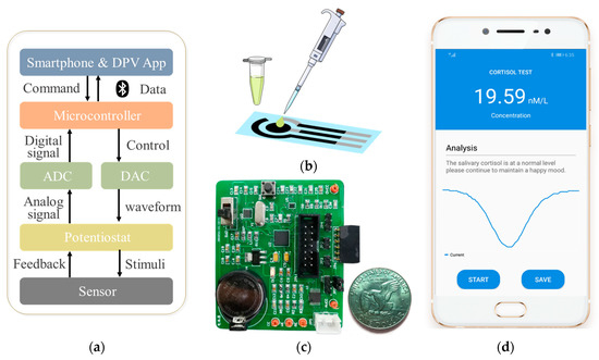 Nowadays, the smartphone has become an indispensable mobile electronic device in people’s daily life worldwide due to their portability, internet connection, powerful data-processing ability and easy operation. The merits of smartphones brought new possibilities for biomedical and biosensor research. Recently, many studies on smartphone-controlled platforms at the point of care (POC) have been published and several electrochemical methods have been combined with smartphone for quantitative electrochemical detections, such as chronoamperometry (CA), cyclic voltammetry (CV), differential pulse voltammetry (DPV) [13,14] and electrochemical impedance spectroscopy (EIS) [14,15,16,17]. Among them, DPV is capable of detection of low-level concentrations of analytes. Some portable devices have been explored for a low-level detection range of cortisol [18,19,20]. However, few studies have exploited smartphone-controlled devices for non-invasive and POC salivary cortisol detection. This requires higher requirements for the performance of a cortisol sensor. Thus, it is crucial to establish a suitable sensing platform with unique properties to cooperate with the smartphone-controlled DPV system to detect salivary cortisol.
