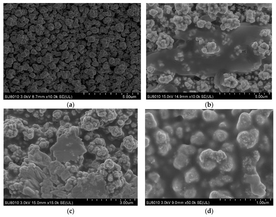 The morphology of gold nanoparticle/molybdenum disulfide/gold nanoparticle sensing platform was characterized by scanning electron microscope (SEM). It was conducted on HITACHI UHR FE-SEM SU 8010 at an accelerating potential of 3 kV and 15 kV. Figure 3a shows the SEM image of the first layer of gold nanoparticles, demonstrating the stacked, closely connected and pebble-liked gold nanoparticles. It can clearly be observed that plenty of gold nanoparticles with diameter of approximately 500 nm stay closely to each other, suggesting that the surface of screen-printed electrodes have been completely covered with gold nanoparticles. Figure 3b illustrates the molybdenum disulfide covered gold nanoparticles, where it can clearly be noticed that the gold nanoparticles have been wrapped with a membrane and the gaps between the nanoparticles were filled with monolayer molybdenum disulfide. This can provide more electrochemical active centers, helping the electrode surface to further bind more gold nanoparticles, and further expand the specific interface to bind with the antibody, so as to increase the directional adsorption of antigen and improve the detection sensitivity. Figure 3c,d displayed the structure of the prepared gold nanoparticles on the molybdenum disulfide/gold nanoparticle-modified electrode. It was observed that the second layer of gold nanoparticles was well dispersed on the molybdenum disulfide with an average size of about 30 nm. Moreover, energy-dispersive X-ray spectroscopy (EDS) was also employed to verify the structure of AuNPs/MoS2/AuNPs (Figure A1). Elements of gold, sulfur and molybdenum appeared in selected area. These results revealed that the layer-by-layer self-assembled AuNPs/MoS2/AuNPs electrode has been successfully constructed.