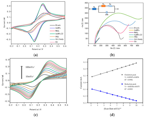 Characterization of the prepared immunosensor. (a) cyclic voltammetry (CV) curves of the proposed EA/CORT-Ab/SH-PEG-COOH/AuNPs/MoS2/AuNPs immunosnsor, (b) impedance spectra of AuNPs/MoS2/AuNPs-modified SPE, (c) CV curves of the proposed immunosensor in 5 mM redox couple with different scan rates (from inner to outer: 10 mVs−1–100 mVs−1), (d) the dependence of redox peak currents vs. the square-root of the scan rate..