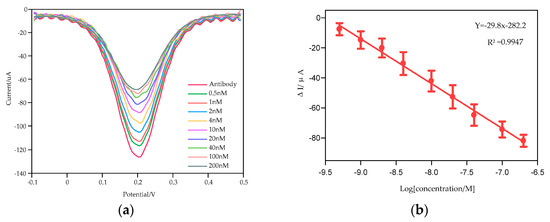 Electrochemical detection of cortisol using smartphone-controlled DPV system. (a) DPV responses of cortisol from 0.5 nM to 200 nM, (b) calibration curve for cortisol immunosensor.