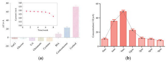 To evaluate the specificity characteristic of the biofunctionalized immunosensors for cortisol, the developed immunosensor was investigated with several common substances in saliva, such as sodium chloride, glucose, uric acid, glutamic acid, cysteine, bovine serum albumin and corticosterone. Sodium chloride and glucose are two basic ions in saliva. Uric acid is an electrochemically active substance existing in saliva which may influence the detection of cortisol. Glutamic acid and cysteine are important amino acids in the human body. Bovine serum albumin is detected here as a representative of macromolecular biological proteins and corticosterone is a derivative of cortisol that has a similar molecular structure with cortisol. As shown in Figure 6a, cortisol is the only substance that caused a dramatic normalized current response while the other investigated interferents consistently exhibited relatively low response current changes, except for that the corticosterone induced a small response which was still far from the signal caused by cortisol. In addition, the current changes detected by the miniaturized smartphone-controlled DPV system were consistent with that of the workstation (Figure A3), which proved once again that the miniaturized smartphone-controlled DPV system is competent in detecting cortisol at POC, eliminating the need to use the bulky traditional workstation. Most importantly, it is verified that the EA/CORT-Ab/SH-PEG-COOH/AuNPs/MoS2/AuNPs fabricated immunosensor is highly specific and selective to cortisol, thus it can meet the requirement of portable system detection and distinguish cortisol from the other interferents. The inset picture in Figure 6a exhibits the stability of the prepared immunosensor tested by the DPV system. It can be seen that the current response remained stable until being stored at 4 °C for six weeks. After that, the magnitude of the current response dropped by 6% in the seventh week and 10% in the eighth week. These results demonstrated that the proposed immunosensor have great potential for noninvasive real human salivary cortisol detection at POC with the smartphone-controlled differential pulse voltammetry system.