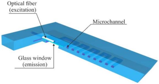 The microsystem for a fluorescent determination of EP was fabricated using LTCC technology. It consisted of a microfluidic channel, a channel for optical fiber and a rectangular glass window, as presented in Figure 3.