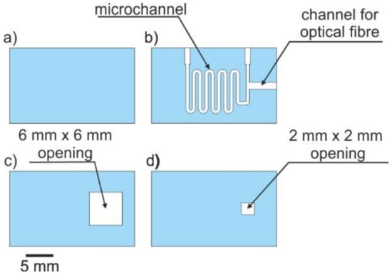 The eight layers of 254 µm-thick DP951 PX LTCC tape were used to fabricate the microsystem. Their layout is presented in Figure 4. Two layers (Figure 4a) defined the top of the device. Four layers with cuts for the microchannel and channel for optical fiber are presented in Figure 4b. Widths of the microchannel and channel for optical fiber were 0.5 and 1 mm, respectively. The glass window was sealed between two bottom layers, the first one with a 6 × 6 mm opening (Figure 4c) and the second one with a 2 × 2 mm opening (Figure 4d).