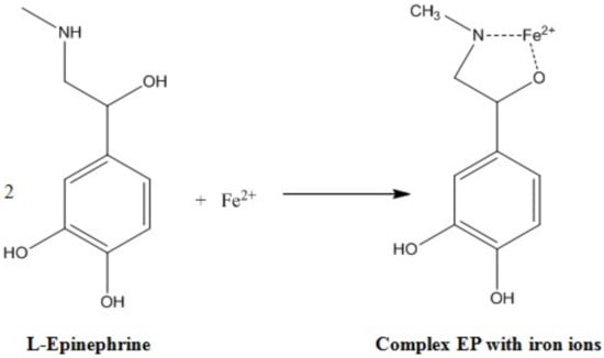 Fluorescence measurements for sensor and biosensor devices were possible due to the formation of a colorful complex between Fe2+ ions and epinephrine molecules (EP–Fe2+). The mechanism of complex formation is not well known. Probably, two hydroxyl groups with adjacent carbon atoms in the aromatic ring of EP are able to coordinate with iron cations. However, this mechanism of complex formation does not explain the selectivity of the process—neither dopamine nor norepinephrine, both of which also possess the same -OH groups, forms the same complex with Fe2+ ions. These compounds are capable of creating similar, colorful complexes with Fe3+ ions []. Therefore, another model of the formation of iron-ion complex and epinephrine was proposed, taking into account structural elements present in both epinephrine and isoprenaline structures []. This model is shown in Figure 6.