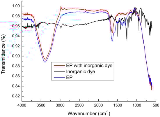 FTIR spectroscopic analysis was also adapted to supply data on the functional groups in the formation of the complex based on inorganic dye and epinephrine, as shown in Figure 8. The peaks belonging to EP (with and without dye) at about 3450, 1550, 1260 cm−1 indicated the presence of hydroxyl O-H, amine N-H, carboxyl C=O and C-O groups, respectively. The signals demonstrated effective formation of the described complex for optical measurement of epinephrine—lower transmittance appeared for O-H/N-H groups (Figure 6).