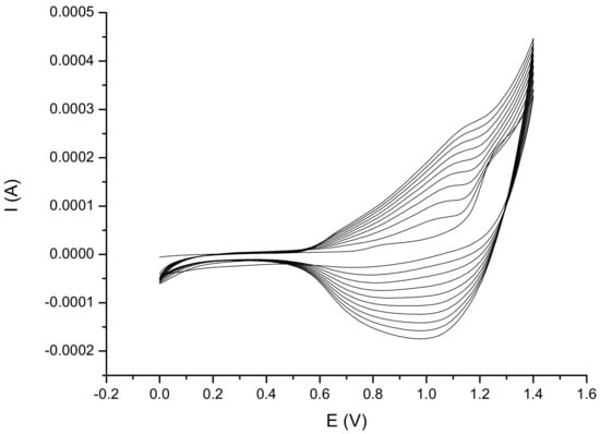 Figure 9 presents the results of the electrochemical polymerization of the monomer. The voltammogram exhibited a successful electrodeposition onto the electrode surface. The graph shows an increase of peak currents in subsequent scans, which suggests the formation and growth of the electroactive polymer.