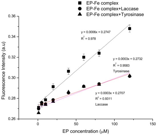 Linear relationship between fluorescence intensity and EP concentration (1–120 μM) for sensor and biosensors (systems employing laccase and tyrosinase).