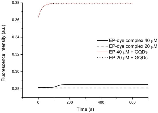The graph shown in Figure 12 indicates that the use of GQDs for the detection of epinephrine is not possible. For both concentrations fluorescence intensity is the same (graphs almost perfectly overlap). In contrast, in the system in which the dye was applied—after stabilization of the measurement system—the fluorescence intensity of the 40 μM epinephrine hydrochloride sample with an inorganic dye is higher than the intensity for the sample at 20 μM. Thanks to that, it is possible to determine the linear range of EP. The lack of fluorescence changes in the system with graphene quantum dots suggests that all the fluorescence received by the sensor comes from quantum dots; epinephrine is not able to quench it. This means that epinephrine is unable to spontaneously polymerize and to create a microfilm of polyepinephrine that could quench the fluorescence of quantum dots.