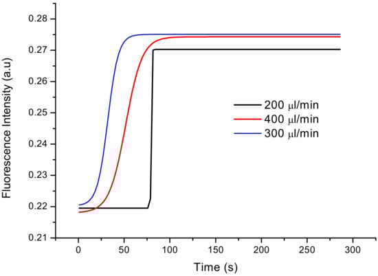 The sensor was tested to determine the influence of its operating condition flow rate on its response and the highest value of fluorescence intensity. For this purpose, sensor responses to different flow rates (200, 300, 400 µL/min) were measured. The LTCC-based sensor output signals for these different flow rates are presented in Figure 13. As demonstrated, the best flow rate was obtained for 300 µL/min. Because of the quick response of the sensor (15 s) and the highest value of fluorescence intensity, this value was chosen for further experiments.