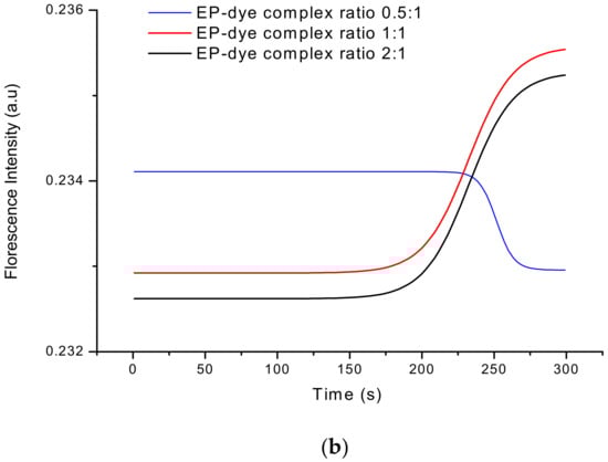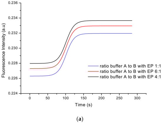 The sensor was also examined to determine the influence of different ratios during inorganic dye preparation (Section 2.2.1) on the value of fluorescent intensity. The most optimal relation for creating EP–inorganic dye complex was also studied. For this purpose, sensor responses to different ratios for an inorganic dye based on Fe2+ ions preparation (buffer A to B in ratios 1:1, 4:1 and 6:1) and for the formation of the EP–inorganic dye complex (dye to EP ratios 0.5:1, 1:1 and 2:1) were measured. The LTCC–based sensor output signals for these different values are presented in Figure 14a,b. As presented, the best fluorescence intensities (for checked relations) were obtained for 4:1 ratio in case of dye, and 1:1 ratio in case of EP–dye complex. Due to this fact, these values were selected for further investigation.