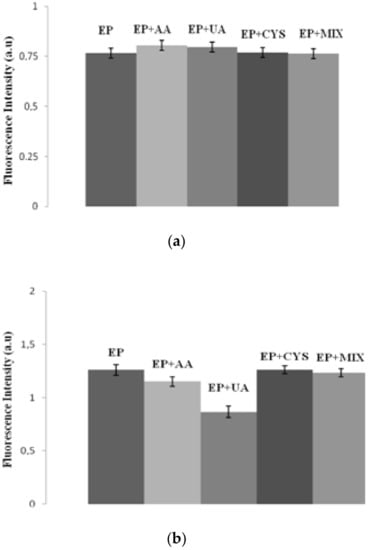 The selectivity and specificity of a biosensor are very important parameters in the context of correct design of biodevices. It means that the biosensor should not be subjected to interference by other neurotransmitters or biomarkers while in use. Described EP measuring systems are designed for quantitative EP detection in human samples. Human plasma or urine contains a number of interfering substances, such as above mentioned ascorbic acid and uric acid. The selectivity investigations for the detection system with and without protein are presented in Figure 15a,b. Based on the results from Section 3.3, the tyrosinase-based detection system was chosen for the selectivity study because of better linearity and lower limit of detection. All interference species were added in significant excess (200%) in relation to the concentration of epinephrine. Figure 15a,b shows that the interfering species, including ascorbic acid (AA), uric acid (UA), cysteine (CYS) and a mix of all tested reagents had nearly no effect (≤2%) in the case of the biosensor and effect of ≤15% in the case of the sensor, indicating the negligible interference of the samples on fluorescence intensity, compared with the blank. The use of tyrosinase in the detection system (biosensor) caused the interfering compounds to have a less significant impact on the measurements than in case of a sensor. However, the fluorescence intensity in this system was lower compared to the sensor system. This fact is connected with the high selectivity of enzymes—their catalytic activity can be limited to even one compound or one type of catalyzing reaction []. Therefore, both the biosensor and sensor exhibited a satisfactory selectivity for EP determination.