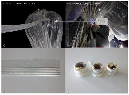 The external envelope of a stratospheric balloon consists of a plastic film with a thickness of a few tens of micrometers (see Figure 1a). The plastic film is reinforced by straps consisting of an assembly of several strands of fibres which are assembled on the load ring (aluminum part) serving as a support for the balloon’s flight chain (see Figure 1b). It is thus the straps that support the load of the gondola. The weight of the load depends on the size of the balloon, from a few kilograms to several hundred of kilograms for balloons with diameters ranging from a few meters to several tens of meters in circumference.