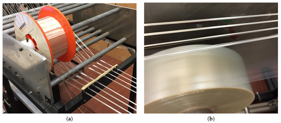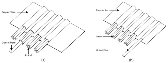 (a) Position of the optical fibre spoo. (b) View of the components of a strap: PET strand, optical fibre and polymer film.