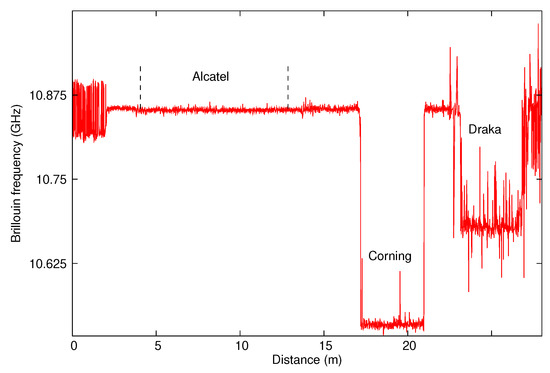 Measured Brillouin frequency along the bare fibres for a 20 °C temperature.