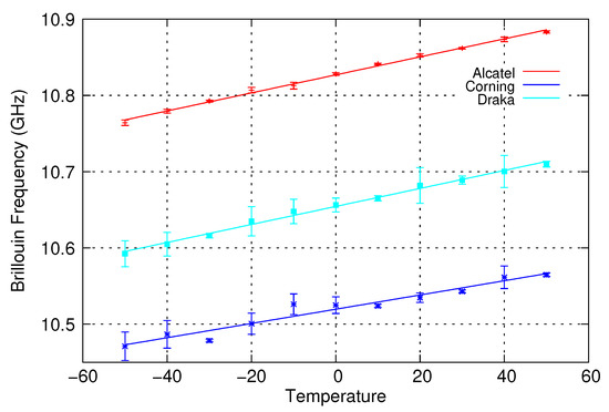 The chain was characterized for temperatures ranging from –50 °C to +50 °C in steps of 10 °C with a minimum of 2 h left between two temperature levels to ensure temperature homogeneity in the chain. The resulting variations are shown in Figure 6. The points in this figure correspond to the average values measured with their associated standard deviation and the lines correspond to the linear fits made on these measurements. The Brillouin frequency varies linearly with the temperature in the considered range for all the samples. The coefficient of variation is 0.934 MHz/°C for the Corning fibre and 1.181 MHz/°C for Alcatel and Draka fibres.