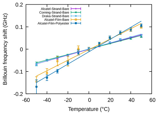 The Brillouin frequency shifts of the different samples are shown on Figure 9. The points correspond to the measurements and the line to the linear fits. The coefficients of variation of Brillouin frequency shifts with temperature of the different samples are listed in Table 1 and compared to those of bare fibres.
