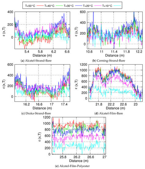 Since the fibre is not bonded to the polymer film for cases presented in Figure 10a–d, it could have been expected to have a strain-free optical fibre and thus measure only thermal expansion effects on the fibre. This is not the case, but it is not the main problem. The main problem is that the contact and friction resulting from the polyester fibres or the polymer film on the optical fibre induces a strain gradient that varies with temperature. This phenomenon is likely to induce measurements interpretation errors. Indeed, the level of strain measured will depend on the change in temperature, the tension in the strap and the friction. However, in the case of an in-situ measurement, it will not be possible to dissociate the three effects. It can also be seen that the different fibres tested and thus the different constitution of the outer coating do not make any differences. It cannot be said that one coating is more effective than another in reducing friction. Only the assembly of the optical fibre glued on the polymer film thanks to a polyester coating makes it possible to obtain a really usable measurement (see Figure 10e). In this case, the stress shift at any point of the optical fibre depends linearly and solely on the temperature increase due to the thermal expansion of the polymer film to which it is bonded.