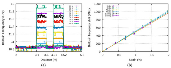 - Horiguchi, T.; Kurashima, T.; Tateda, M. Tensile strain dependence of Brillouin frequency shift in silica optical fibers. IEEE Photonics Technol. Lett. 1989, 1, 107–108. [Google Scholar] [CrossRef]
