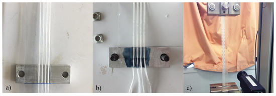 (a) Assembly of clamping parts and straps before bonding according to method 1. (b) Assembly of clamping part and straps according to method 2: the film is bonded over half the width of the clamping parts and the strands and the fibre are bonded over the other half. (c) Assembly of a test specimen in the tensile machine.