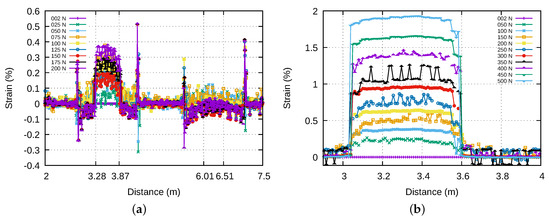 Strain measured by optical fibres inserted in straps. In (a) only the polymer film is bonded to clamping parts. In (b) the optical fibre is bonded with the polyester coating to polymer film while the polymer film and the strands are bonded to clamping parts.