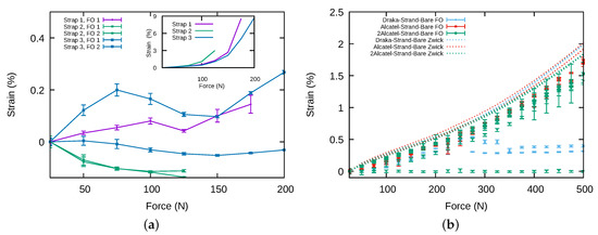 (a) Strain measured by the tensile testing machine and the optical fibres when the polymer film only is bonded to clamping parts. (b) Strain measured by the optical fibre when the polymer film, the optical fibres and the strands are bonded to clamping parts (FO denotes strain measured by optical fibres and Zwick strain measured by testing machine).