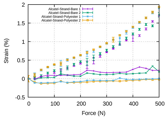 Finally, the Figure 15 shows the comparison of the strain measurements performed with a bare Alcatel fibre and an Alcatel fibre coated with polyester. The points corresponds to raw fibres strain measurements and the lines with points to the difference between fibres measurements and tensile testing machine measurements. As expected, the measurements made with polyester coated fibres are closer to the machine measurements especially for higher strains. Optical fibres coated with polyester to ensure adhesion with the polymer film should therefore be preferred for instrumentation where high accuracy is required. However, it is important to note that the thickness and the type of the bonding agent can significantly affect the strain transfer mechanism between the host material and the optical fibre (e.g., optical fibre to balloon envelope or optical fibre to clamping parts); thus, part of the reported deviations may also be attributed at this effect. This phenomenon is described in the reference [18]. Thus, as part of the industrialisation of the strap manufacturing process, a specific study should be carried out on the choice of these two parameters.