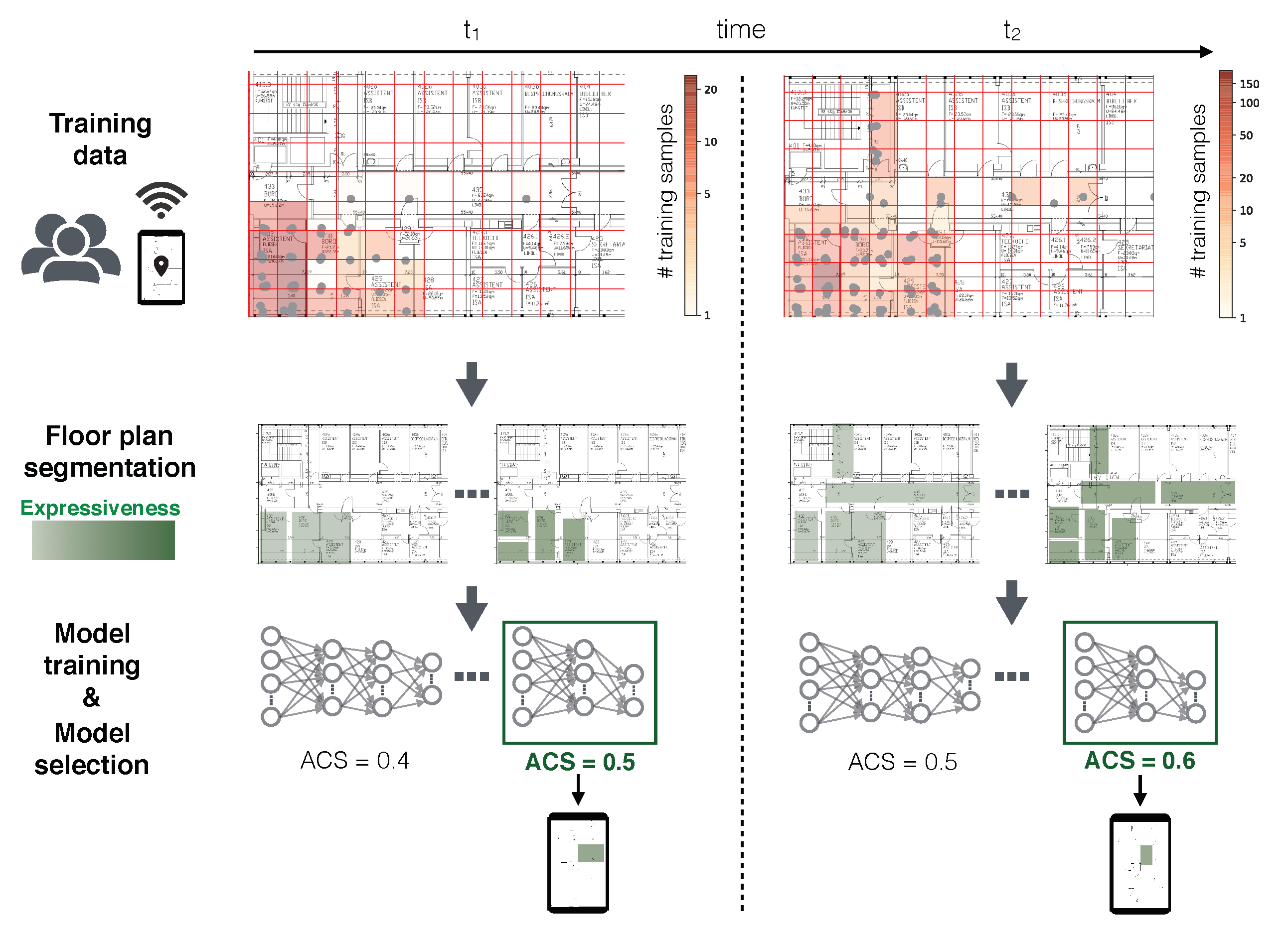- When crowdsourced training data is generated continuously, the area classifier has to adapt to the current data basis. This is accomplished by recomputing the underlying floor plan segmentation and retraining a classification model on the data labeled with the corresponding areas. In this setting, is the proposed ACS suited for automatic model selection among a pool of models that provide varying performances and expressivenesses?