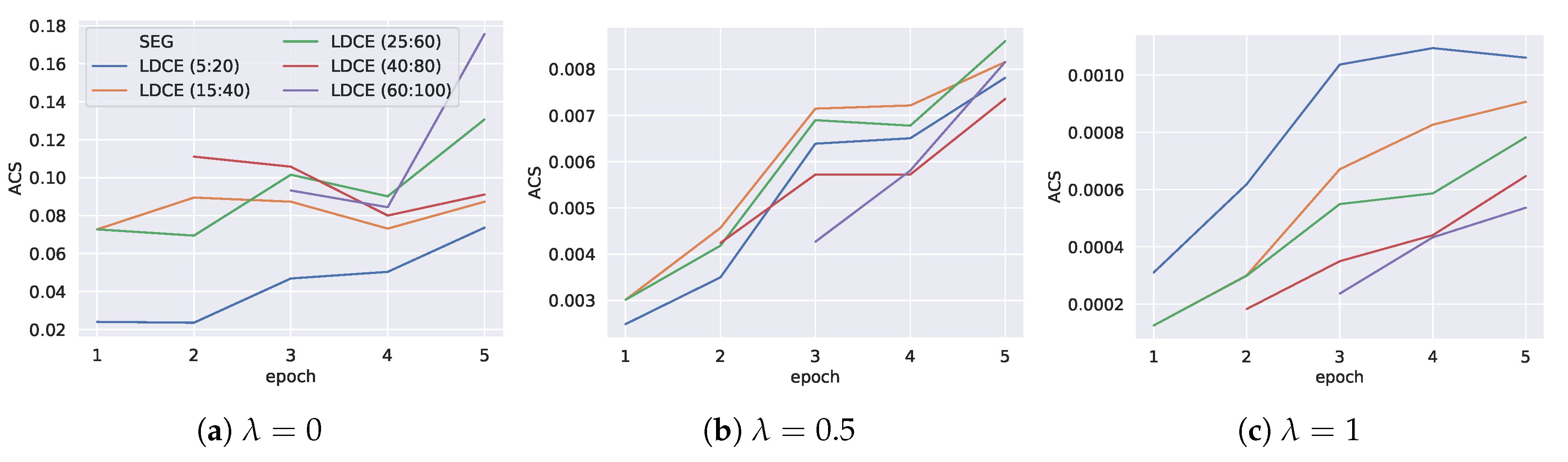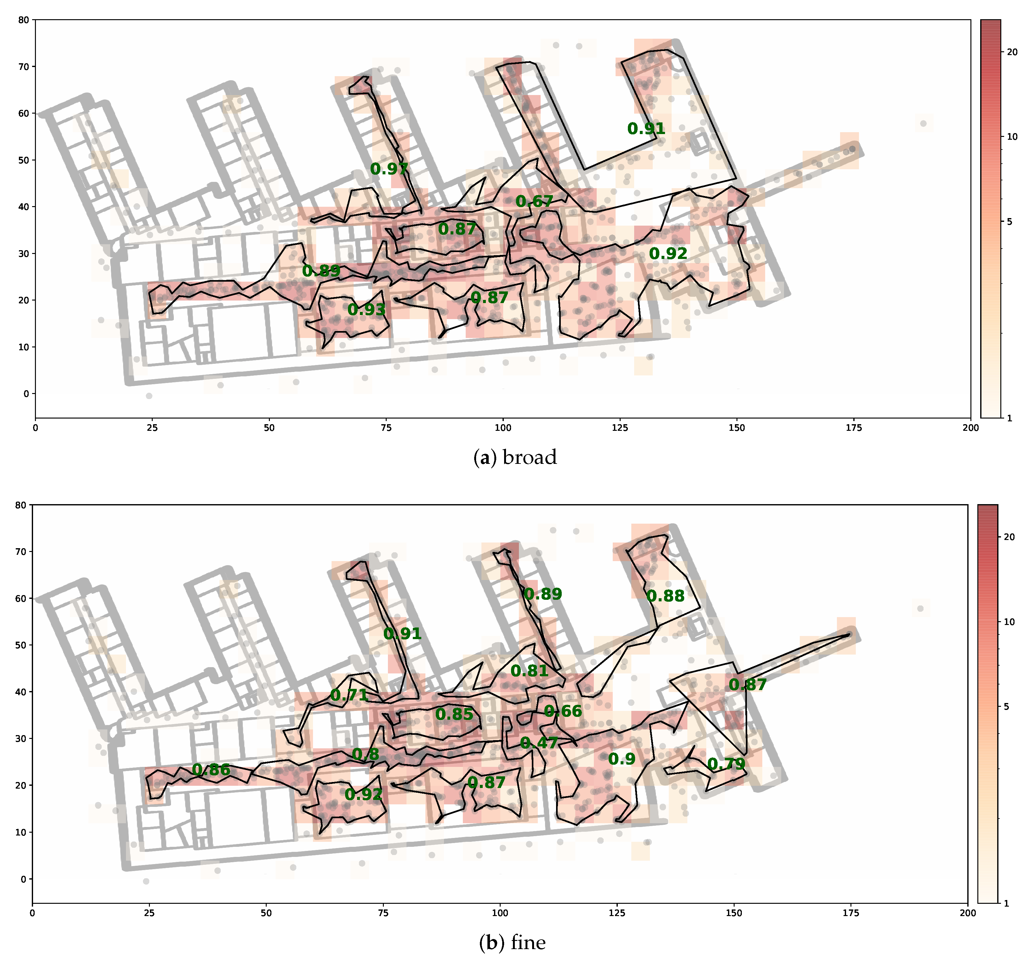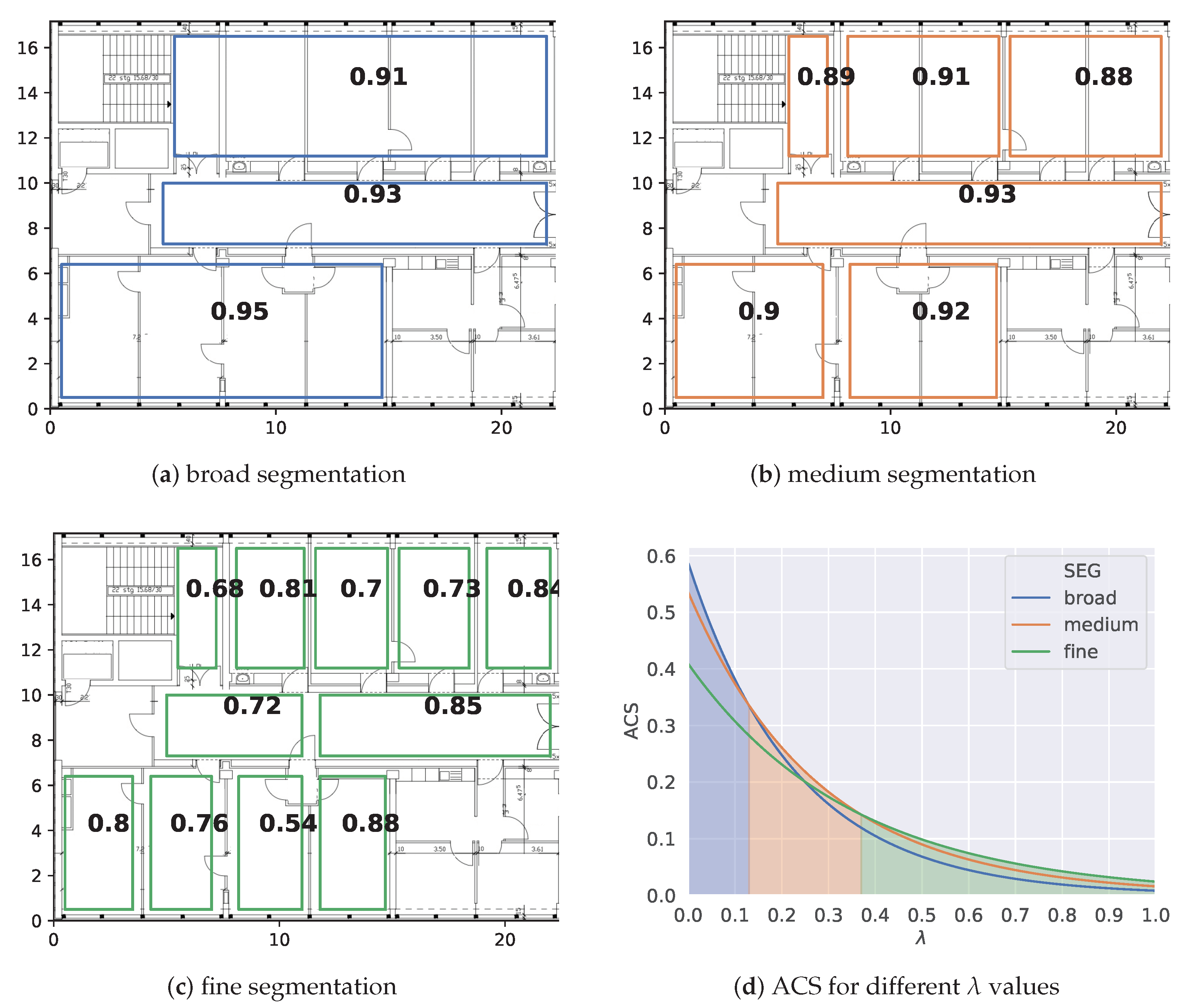 - Model selection via ACS for continuous data collection (Section 6.2.2 and Section 6.3.2): we subdivide all available training data into 5 epochs that contain roughly the same amount of additional data to simulate the continuous data collection. For each epoch we compute a pool of floor plan segmentations, where we choose the parameters and empirically to obtain segmentations with various granularities. Subsequently, we optimize a classifier on the data labeled with the areas. The parameter has to be chosen according to the use case requirements. We exemplarily choose the outer bounds (0 and 1), where 0 provides high performance and low expressiveness and 1 targets models with higher expressiveness. Furthermore, is chosen to select a balanced model. We demonstrate how to utilize the ACS to automatically select the optimal model for the given use case requirements.