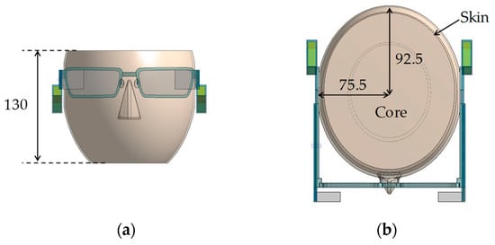 Table 1 lists thermal properties of the smart glasses used in our basic analysis. Figure 2 shows dimensions of a face/head model. For a face model, we referred to a model of human thermoregulation [55] and used a simpler model. The skin thickness was 2 mm. The core and ambient temperatures were set to 36.6 and 25 °C, respectively. Figure 3 shows dimensions of the smart glasses.