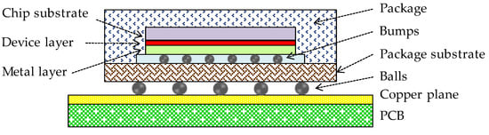 For modeling heat generating components, we used the PCB with a flip chip-ball grid array (FC-BGA) package shown in Figure 4 as an example. However, types of packages (e.g., wafer level package (WLP)) and boards are not greatly restricted because a heat generating component is modelled very simply as a structure shown in Figure 6. The idea of the thermal modeling presented in this paper can use not only rigid boards but also flexible substrates [58,59,60] such as polyimide and polyethylene terephthalate (PET). However, if such flexible circuits are used, the model of device body parts should be replaced with a more appropriate thermal model.