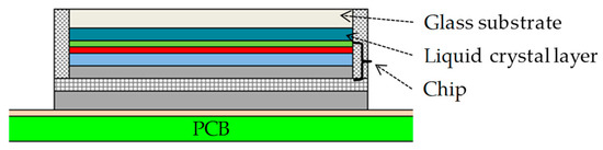 In general, heat generating components of smart glasses include processors, memories (e.g., DDR4 SDRAM, and NAND flash), audio ICs, wireless modules, power management ICs, and LCOS devices. Figure 4 illustrates an example of a cross-sectional structure of an IC package with the flip-chip technology. Table 2 lists an example of the thermal property and thickness of each layer. Figure 5 illustrates an example of a cross-sectional structure of an LCOS device. Table 3 lists an example of the thermal property and size. The heat generating components are composed of various structures and thermal properties.