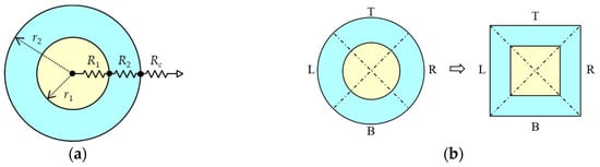 where hc is the heat transfer coefficient. In this way, all the necessary resistances can be obtained. By assigning them the model of rectangular batteries (i.e., by converting a circle into a rectangle as shown in Figure 8b), a cylindrical battery is also applicable.