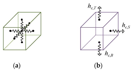 Thermal resistance circuits: (a) 3D heat conduction resistance model for one thermal cell, and (b) heat convection resistance model with convection heat transfer coefficients.