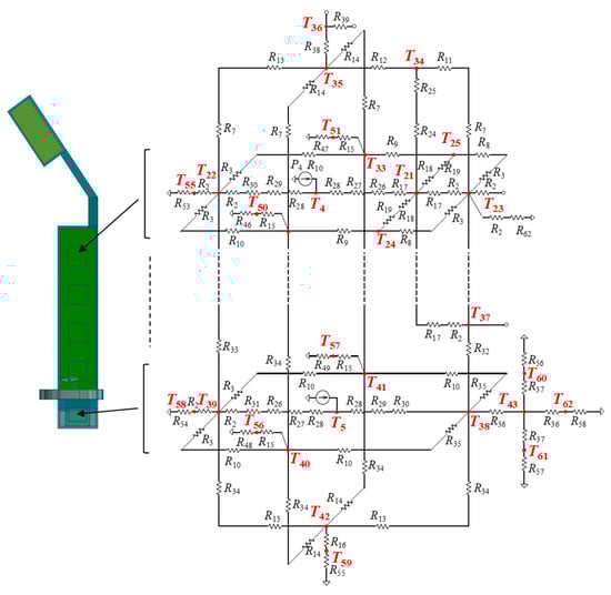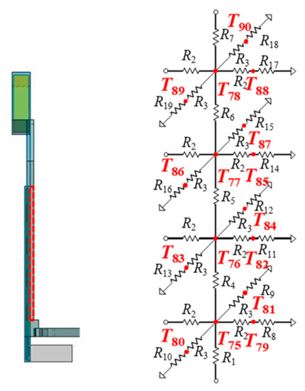 where S is the heat dissipation area. The convection heat transfer coefficients for the top, bottom, and side are distinguished, as shown in Figure 10b. The thermal resistance model for each part is created by setting thermal cells in heat transfer paths. The number of thermal cells depends on heat flow rates on the heat transfer path. The heat convection resistances are connected to the thermal cells in contact with ambient air. The ambient temperature is connected to a circuit ground.