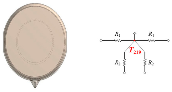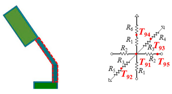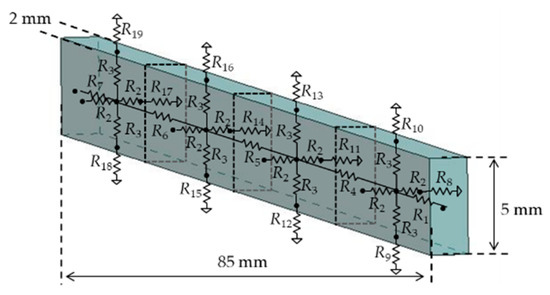 A temple of the glasses is divided into four cells to enable the connections with four heat generating components of a device body (see Figure 11). In this case, the method to derive resistance values of the thermal model is described in detail. Figure 12 shows thermal resistance circuits with the structure of a glasses’ temple. The temple is divided into four thermal cells. A thermal cell consists of the 3D heat conduction resistance model in Figure 10a, which has six resistances in three dimensions from the center of the thermal cell. For simplification, series resistance is expressed by one resistance. Heat conduction resistance values are calculated by substituting the length, thermal conductivity of the material, and area into Equation (4). For example, R3 in the vertical direction of one cell is 0.25 K/W from l = 2.5 mm, k = 236 W/mK, and S = 85/4 × 2 mm2. Table 4 summarizes the heat conduction resistance values for a temple.