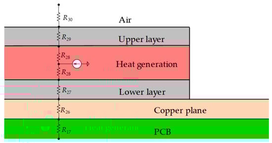Figure 13 shows a thermal model around a heating component, which is composed of thermal resistances for each layer in the vertical direction and a heat source connected in the center of a heat generation layer. The heat source is given by power dissipated by a heat generating component. A power consumption value (in Watt) is given to the heat source. A thermal model of an electronic device body that incorporates five heat generating components is shown in Figure 11. It is a model for the device body of the right side. The device body is composed of heat generating components, PCBs, copper planes, device body cases, and a projector. Their parts are replaced by thermal cells. For example, a PCB is replaced with four thermal cells. The thermal resistance values in each thermal cell are calculated from the length, thermal conductivity, and cross-sectional area of a cell, as shown in Equation (4). The heat dissipations are set to four points at the front, back, top, and bottom of each heat generating component. A heat generating component represented in Figure 6 is modelled to the equivalent thermal resistance circuit in Figure 14. The heat source is located in the center with a current source symbol. Five heat generating components are arranged in the body case.