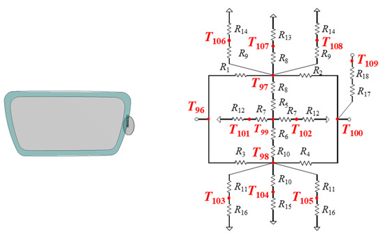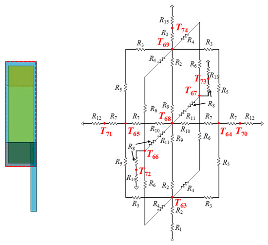 For a battery model, the inner liquid fluid and outer frame are represented by thermal resistances. Figure 16 shows thermal resistance circuits of a battery structure. R1 is the resistance to connect with a device body, R2 to R8 are the resistances of a frame, R9 to R11 are the resistances of the inner parts, and R12 to R15 are the heat convection resistances. Figure 17 shows the thermal model of the battery on the right side. The number of thermal cells used for a battery in this paper is seven. The heat dissipations are set to five points at the front, back, top, bottom, and tip of each cell of a battery.
